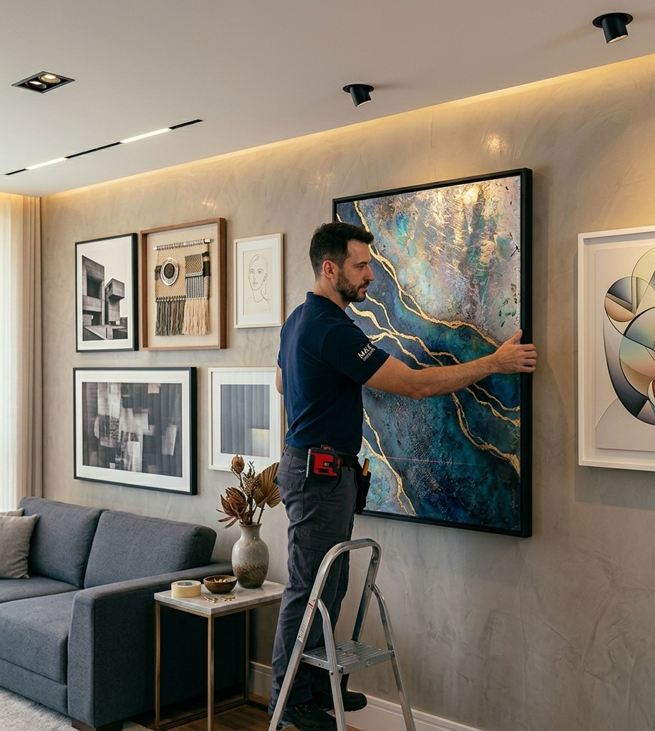 Na Max Suportes, levamos a sério a estética do seu ambiente. Mais do que pendurar objetos, realizamos instalações técnicas de quadros, telas e composições artísticas com precisão milimétrica, garantindo segurança total para o seu patrimônio e um acabamento de alto padrão.